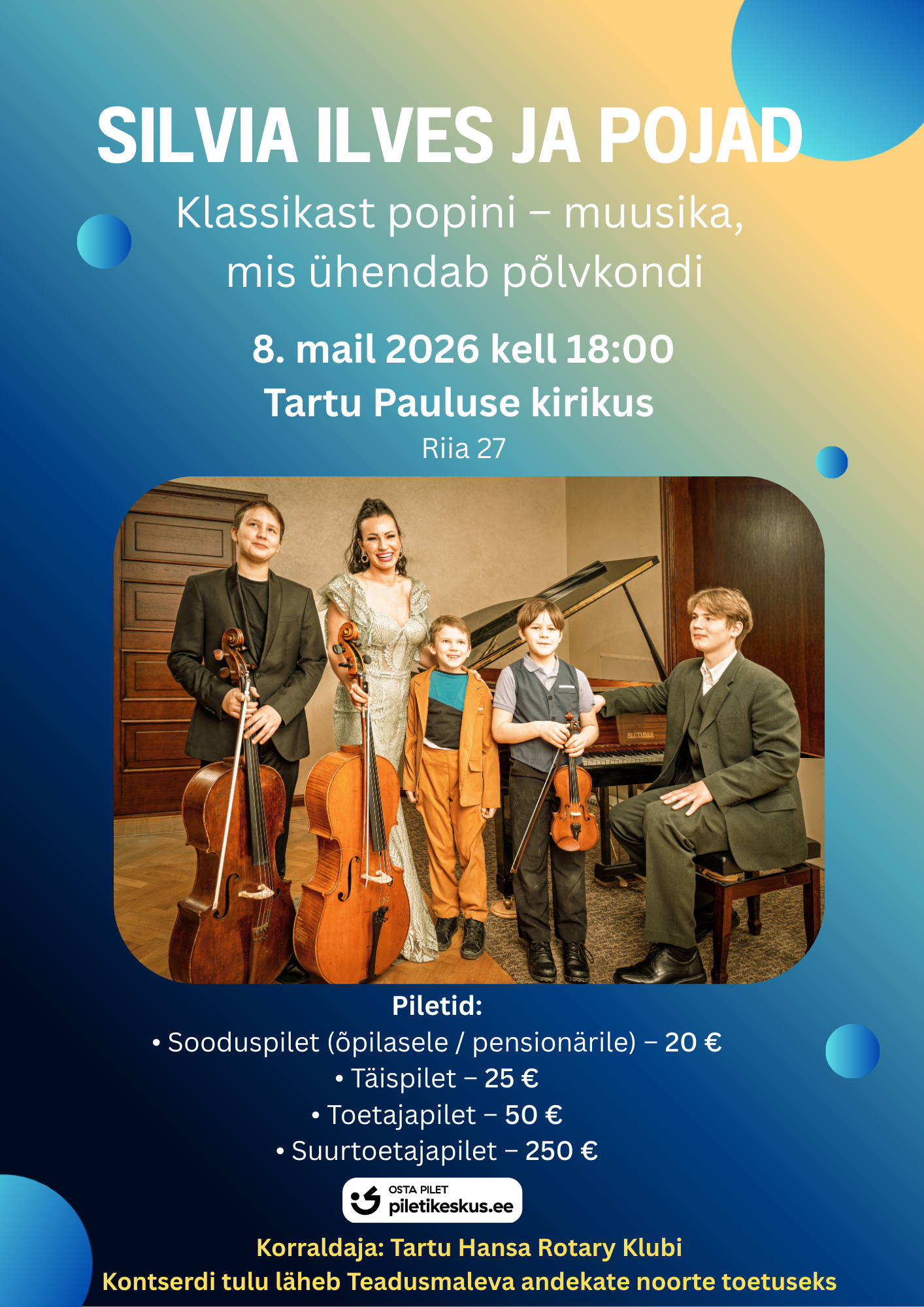 Tunnustatud tšellist Silvia Ilves koos oma poegadega pakub ainulaadse elamuse Tartus. Perekond Ilvese kontserdil kõlav repertuaar hõlmab nii klassikamuusika kui popmuusikamaailma pärleid. 15-aastane Stefan ja 13-aastane Tristan on nii rahvusvaheliste kui ka vabariiklike konkursside laureaadid. Kontserdil astuvad üles ka 9-aastane